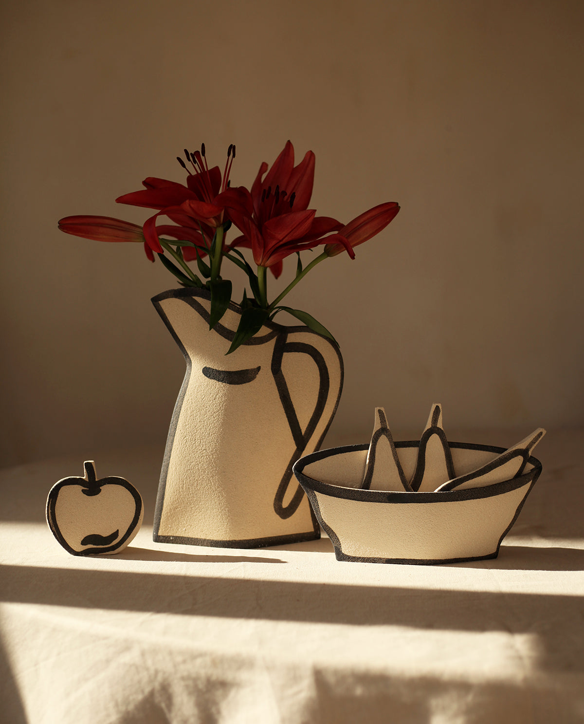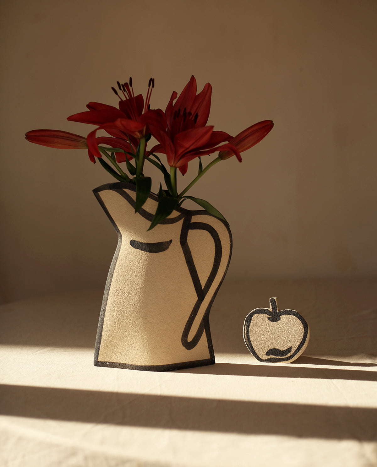 Nous sommes ravis de partager avec vous le premier ajout à la collection 2024 d'INI CERAMIQUE. Inspiré par les œuvres du peintre Giorgio Morandi, notre designer a réinterprété et conçu ces vases avec sa propre sensibilité. Le 'Morandi Pitcher - Black' présente de délicates illustrations à l'engobe, disponibles en noir ou en bleu, qui harmonisent esthétiques traditionnelles et modernes. Réalisées par notre designer, les motifs sont appliqués à la main avant la première cuisson, imprégnant le vase d'une touche rappelant l'art figuratif traditionnel. Après une seconde cuisson à 1250°C, un émail transparent est ajouté à l'intérieur pour une finition raffinée, assurant durabilité et praticité au vase.