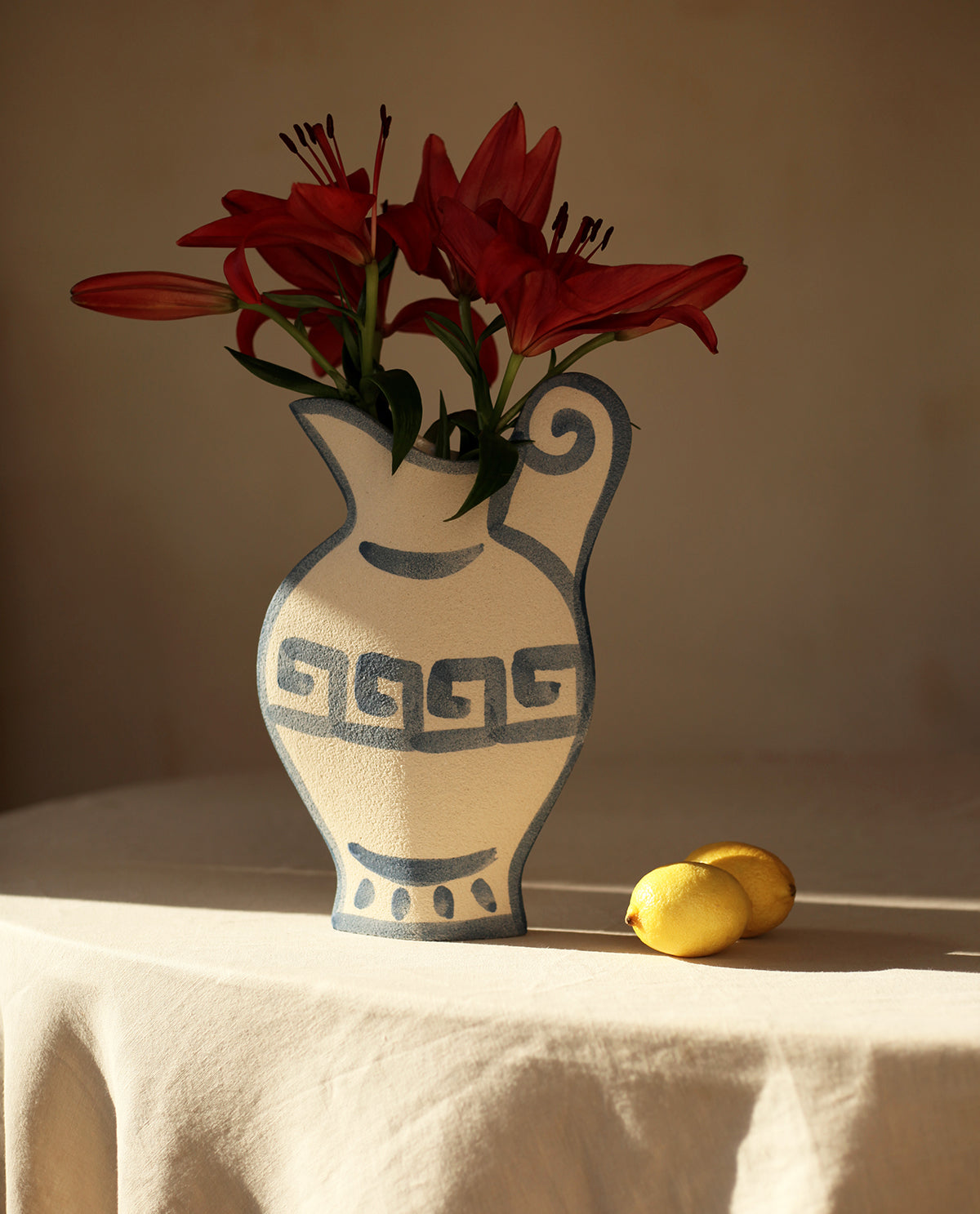 Faisant partie d'une nouvelle ligne qui marie la poterie grecque antique au design contemporain, le vase 'Pichet Grec N°2' présente de délicates illustrations bleues qui harmonisent les esthétiques traditionnelles et modernes. Conçu par notre designer, les motifs sont appliqués à la main avant la première cuisson, conférant au vase une touche rappelant l'antiquité. Après une seconde cuisson à 1250°C, un émail transparent est ajouté à l'intérieur pour une finition raffinée, assurant durabilité et praticité au vase.