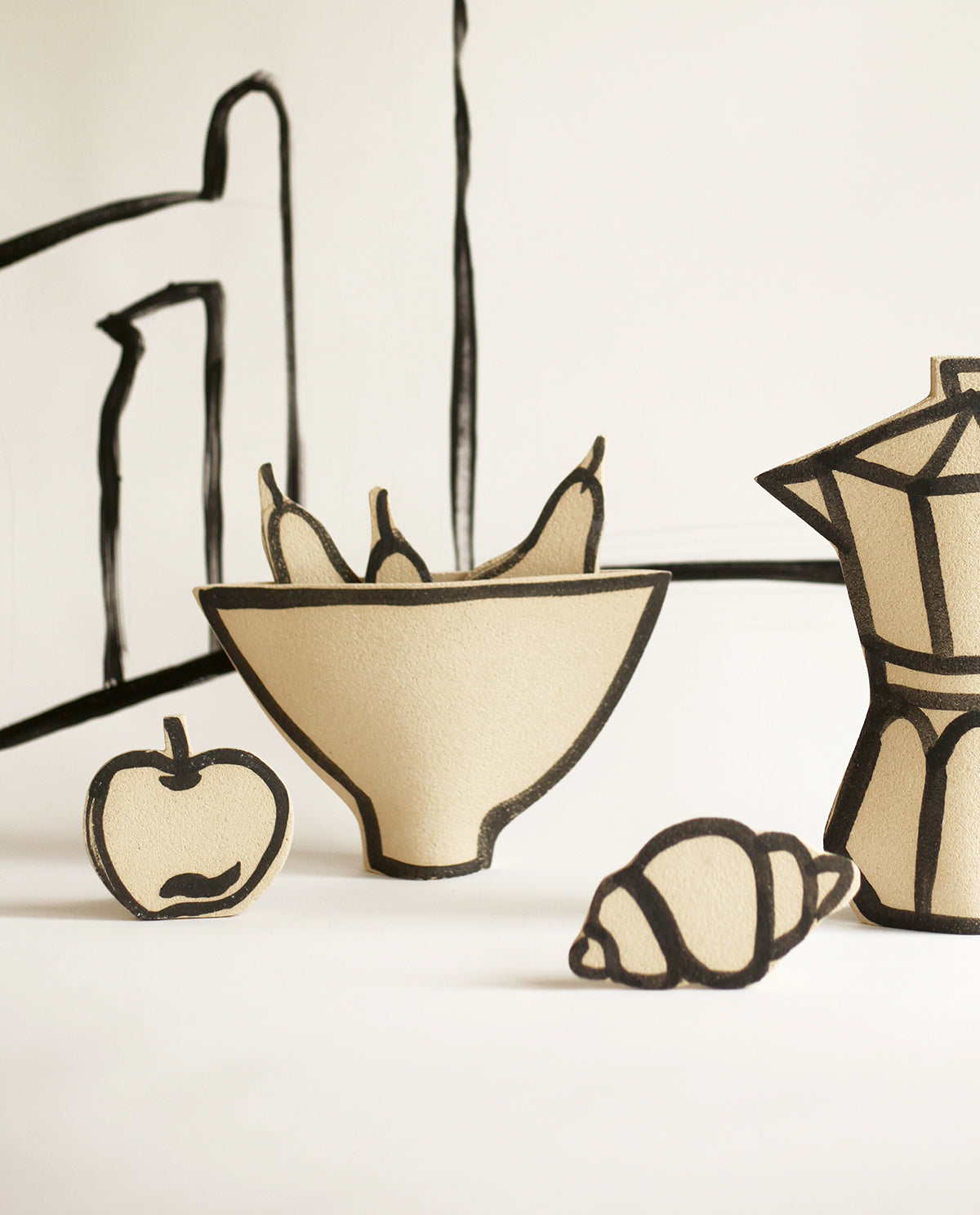 Each piece is entirely handmade by our designer using chamotte stoneware, with black underglaze illustrations applied before the initial firing.