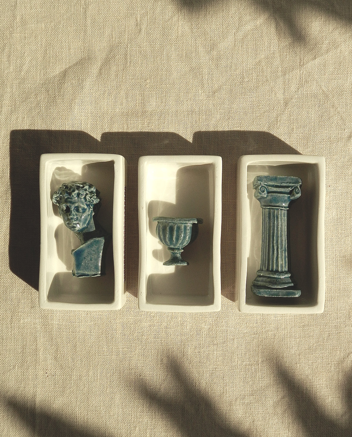 To complete your piece, we offer optional add-ons: you can choose between red, blue or black 7.5 cm matches, a bouquet of paper roses or handmade ceramic Greek decorations.